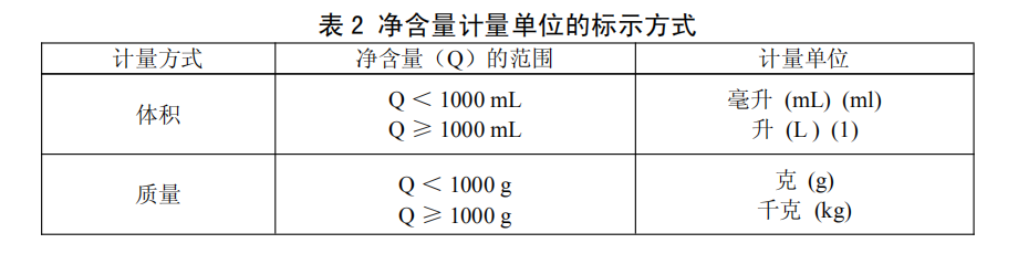4.1.5.3 凈含量的計(jì)量單位應(yīng)按表 2 標(biāo)示。
